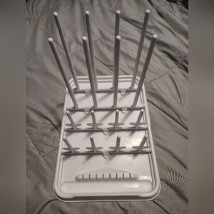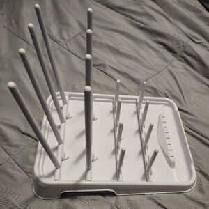 Compact white bottle drying rack with multiple slots for efficient drying. Can be folded down for easy storage.