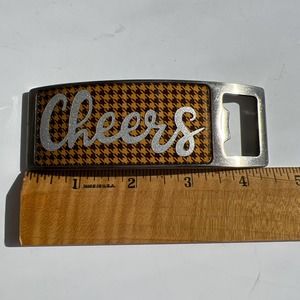Bottle Opener, Metal in brushed nickel color, stainless steel, has Resin covered Brown Houndstooth print with a Cheers label in silver sparkle vinyl. OOAK Custom. Nice as a gift. Open has been used and in very good condition. Sparkle label has been added for this listing.