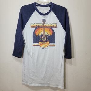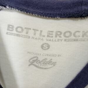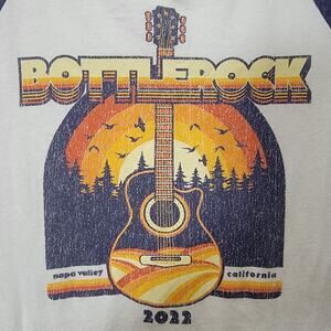 BottleRock Music Festival size Small graphic Baseball Jersey tee shirt. From the Napa Valley concert in 2022. Classic baseball style tee shirt. Navy blue sleeves, white base with orange and red 70's style design. Bringing nostalgia and style together. 100% cotton. Measures 20" across pits and about 31" long from top of shoulder to hem. Very nice condition. Nonsmoking home with awesome pugs and a crazy bulldog.