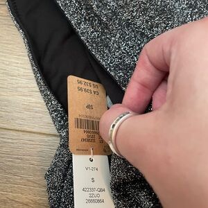 This is a NWT black and silver lined bikini bottom, made by PINK by VICTORIA'S SECRET. It is made of 63% recycled polyamide, 14% elastane, 13% polyamide and 10% metallic fiber. Both small and medium sizes are for sale.