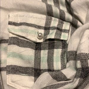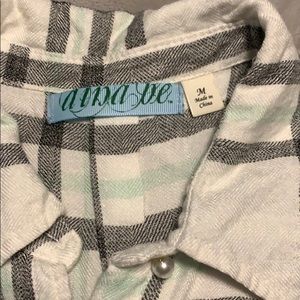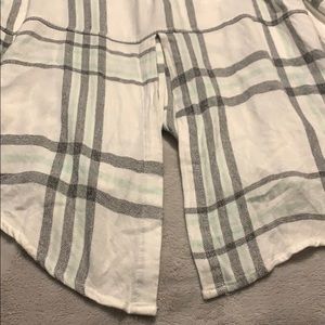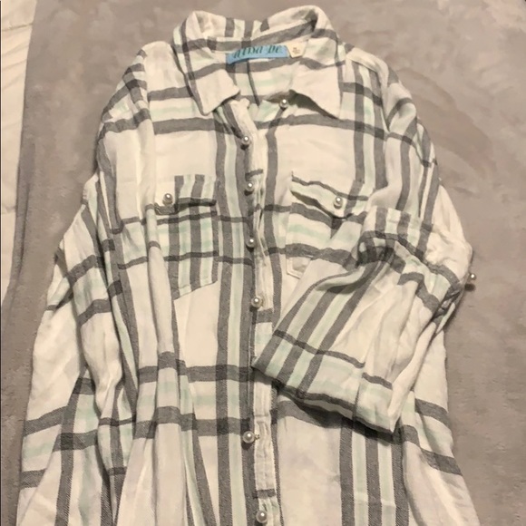 White, gray and pale green button down with pearl buttons. split detail midway up the back