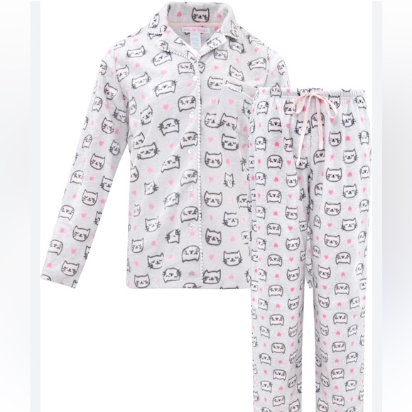 Super comfy and warm pajama set with full length pants and button up top. Super cute kitty print and front pocket.