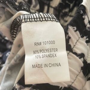 Super stretchy and comfy with cute black and off-white pattern. Red and green stripe down sides and black tie at waist.