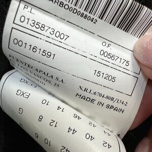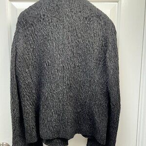 Stylish black boucle jacket with 2 button closure on the collar. Almost a swing fit, yet still slimming silhouette. Beautiful, unique fabric, made in Spain. Size 42 fits a Medium or 8/10. I will upload measurement pics soon. Thanks for looking.