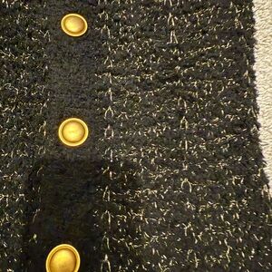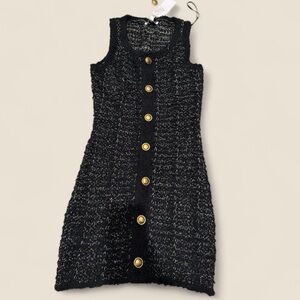 Black boucle dress features eye-catching gold buttons, perfect for any special occasion.