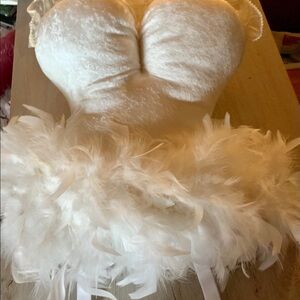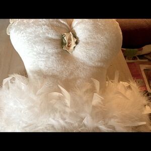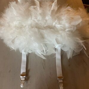 Velvet, a satin rose, seed pearl trail, lots of fluffy feathers, and of course garters! So unique!