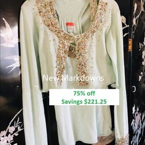 Light lime, metallic beading and sequins camisole and cardigan. Camisole has beading on the front and back neckline. Made of 60% cotton, 40% nylon, hand wash. Pit to pit 15.5 inches and 26 inches length from top of back to hem. Original tag $136.00. Cardigan matching the camisole top with same beading down the front , neckline and sleeve hem. Pit to pit 19 inches, 17 inches length=shorter than camisole. Size L/XL. Original tag $156.00. Selling as a set (unless requested separate).