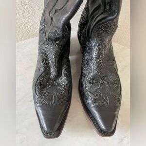 Description: heavily tooled, beautifully crafted black leather snip top cowboy boots