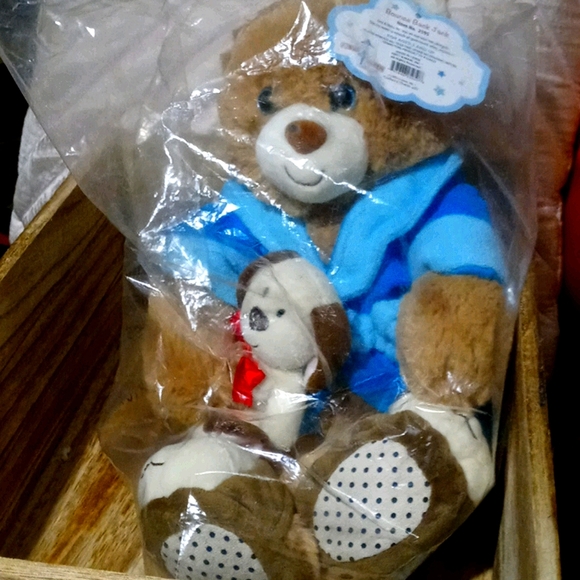 The Plush Stuffed Blue on Brown Bear is super soft and cuddly, that will be sure to put a smile on your child's face. The 10 Inch sitting bear is decorated with and a terry blue cloth bathrobe The bear also comes wearing a pair of Dog slippers and a white dog plush doll of his own. The Plush Blue on Brown bear is a great addition to your child's stuffed animal collection