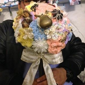 This is my bouquet. It was supposed to be all brooches, but I didn't get enough so I used the crocheted flowers my maid of honors mom made for my bridal party. Not exactly what I had pictured, but it's so much more special now ❤️😍