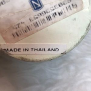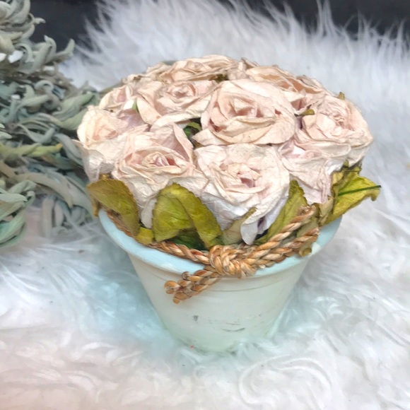 Paper Roses are off white and green in small white ceramic pot. Very nice for home decor.