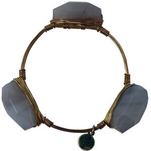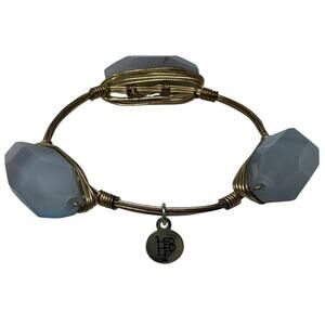 Elevate your look with this handcrafted Bourbon & Boweties bangle featuring three large blue faceted stones wrapped in gold-tone wire. Signature artisan design with a lightweight, comfortable fit — perfect for stacking or wearing as a standalone statement piece. A timeless accessory that blends Southern charm with modern elegance.