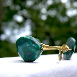 Delicate gold plated copper wire-wrapped bangle adorned with three green stones.