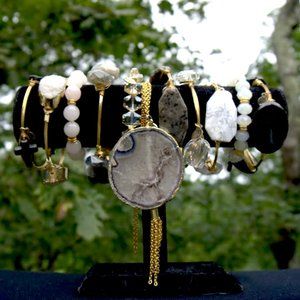 Delicate gold plated copper wire-wrapped bangle adorned with three black stone pieces.