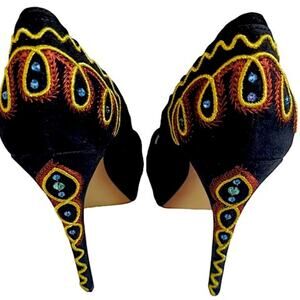 Elevate your outfit with these gorgeous platform stilettos with heel embellishments. Black suede offers a sharp contrast with the gold and red trim and blue stones.