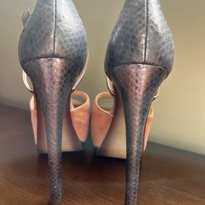 Peach suede, grey snake print leather with pink gold patent leather strap. Super sexy!!