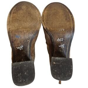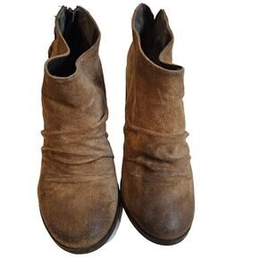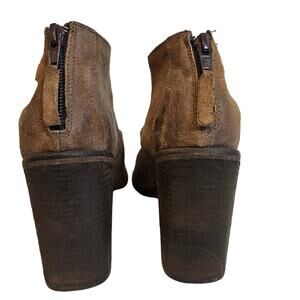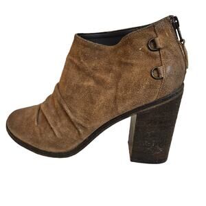 Dark tan Suede ankle Booties with burnishing and ruffling detail at toes. Stacked block 4 inch heel, back zip with D ring accents. 100% suede leather upper, man made sole. Very good condition.