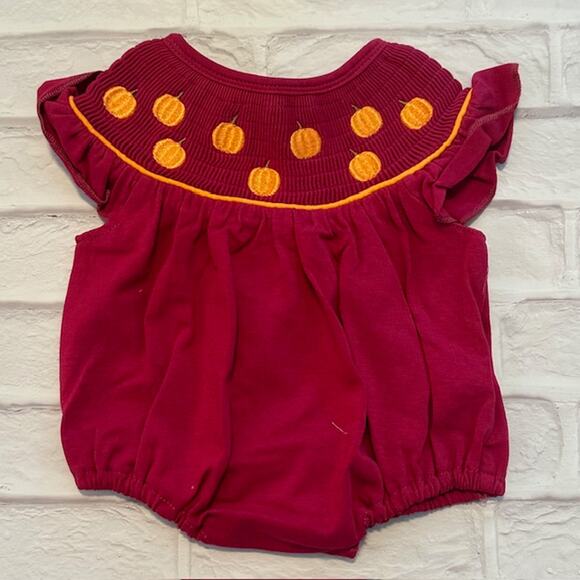 From the Abby & Evie boutique line comes a 6 Month baby girl red short sleeve one-piece with embroidered pumpkins. perfect for the fall harvest. Can be worn with an undershirt for cooler weather.