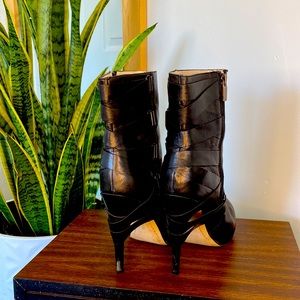 Boutique Black Leather Strut Strappy High Heeled Boot Womens 8M