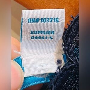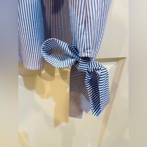 Worn once. Top of the blouse is navy blue lace and the bottom is blue and white pinstripe. Pullover style with double button and keyhole at back of neck. Bow detail on left side at bottom hem. Measures 28” from top of neckline to hem and 26” from underarm seam to underarm seam.