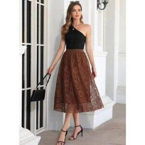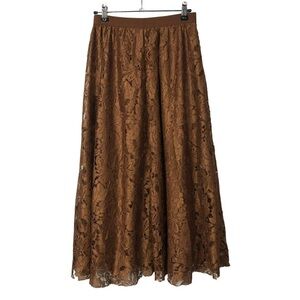 Boutique Brown Lace High Waist A-Line Midi Skirt