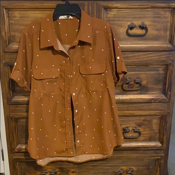 Great colors for fall! Rusty brown with cream small polka dots, cuffed sleeves with button.