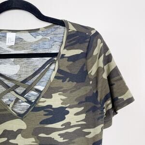 - Camo Printed Cross Front V Neck Short Sleeve Tee