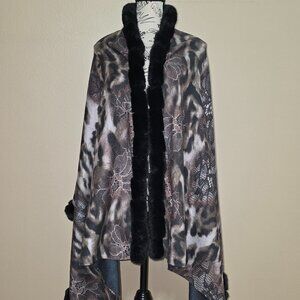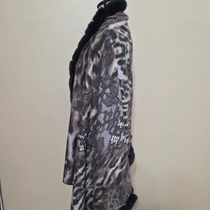 Gorgeous and luxe wrap featuring a mixed animal print + lace pattern in taupe, brown, cream and black tones. Trimmed with ultra-soft black faux fur along the front and hem for an elegant, warm finish.