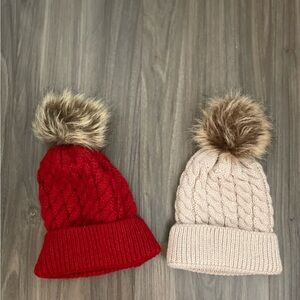 Keep your little one warm with this adorable set of knit beanies. Featuring a vibrant red and a soft cream color, each hat is topped with a playful faux fur pom-pom. Perfect for adding a touch of style to any winter outfit.