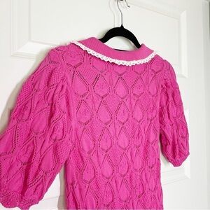 Pointelle knit sweater short sleeve top with collar and scalloped trim in bright pink. 63% Viscose, 37% Nylon. Great condition—worn once. Perfect for Valentine’s Day.