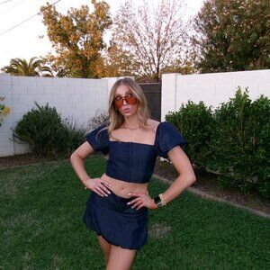 Super cute "denim" set from a boutique. Material is denim patterned, but is soft and unstructured. Wearing a size small in the photo. Only worn once!