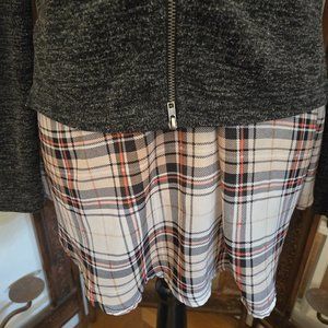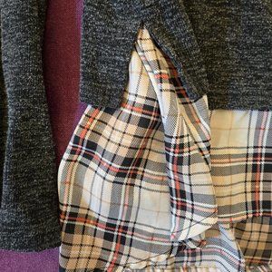 Punk-rock or grunge style, this soft, warm sweater is a charcoal heather grey with a tan, red, black, and white plaid addition at the bottom hem. So cute! It has vents at the sides to show the plaid accent better.