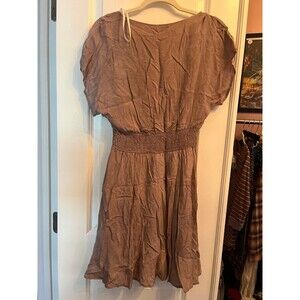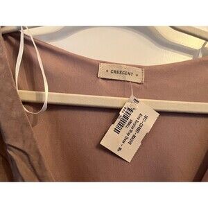 Mauve colored dress, rusched waist, hits above knee, crinkly look to fabric.