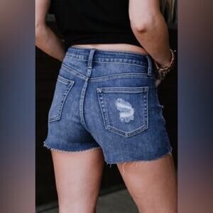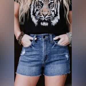 The shorts are a medium wash denim, lightly acid washed & distressed, high rise, cut off/raw hem, classic 5 pocket design, stretchy cotton jean shorts.