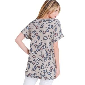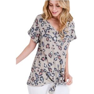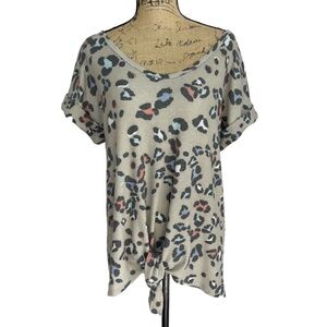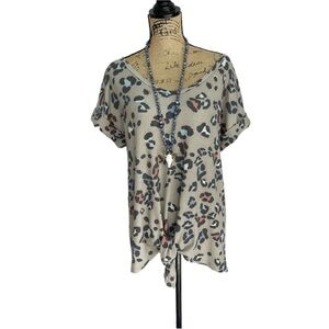 Boutique Leopard Print Tie Waist Hi Low Blouse Size Medium Tan and Blue