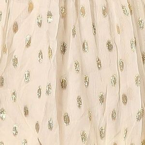 Satin sash can be worn tied or tucked, metallic accent chiffon skirt. Color on tag is "Taupe."