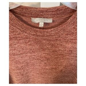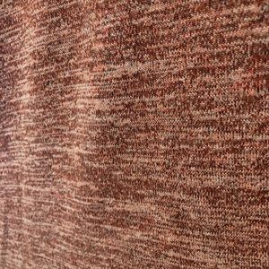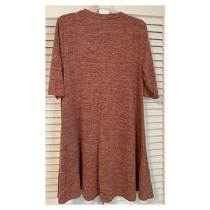 Worn only once! This is a mockneck sweater dress. Made of polyester and rayon, it is a thin sweater material. 3/4 sleeves - 14 inches from shoulder, Dress length from shoulder to bottom is approx 34 inches. Color is an orange/burnt orange/red color. See last photo for closeup of pattern and color.