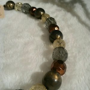 Golds, cream, and green mixed together to make the perfect combination. This necklace would be perfect paired with a longer layering necklace to accent the beading! Total length end to end including difference for clasp options 15.5 - 16.75"