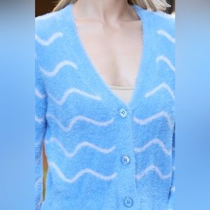 Brand new boutique item, light blue soft fuzzy patterned sweater with button closure and wavy striped pattern.