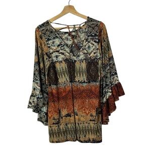Boutique Now N Forever Brown Boho Printed Long Bell Sleeve Top L