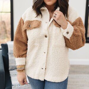 Boutique | Oversized Color Block Sherpa Shacket/Jacket | Camel & Cream | L