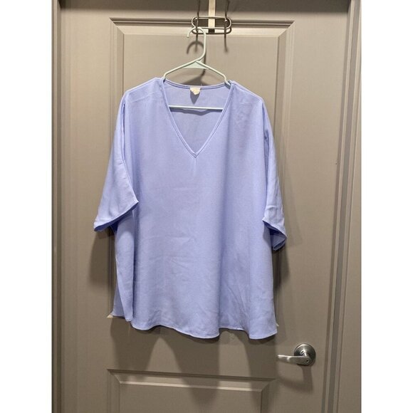 Worn once boutique light blue V-neck top. Size M with an intentionally oversized fit—comfortably fits up to a 1X while keeping its flowy shape (too big for a true medium). Features longer sleeves for great arm coverage, breathable lightweight fabric, and a flattering neckline. Perfect for summer, work, or casual wear. Easily style with trousers, jeans, or shorts!