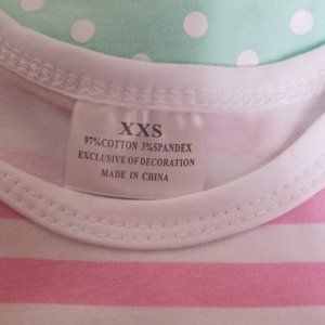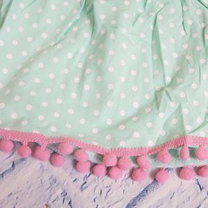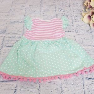 Boutique dress for kids. Pink and white stripe top. Mint and white polka dot bottom. Bottom hem accented with pink puff ball tassels. Flutter sleeve matches bottom skirt print.