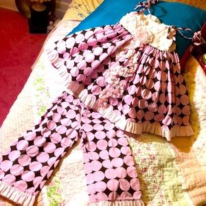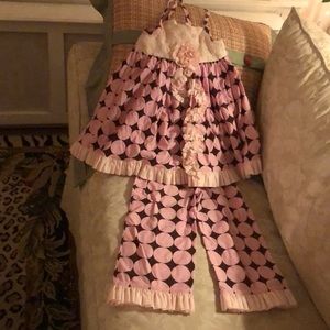 Excellent Condition.pink with brown circles. tie to adjust at shoulders. Terry cloth flower in middle. Very rare item
