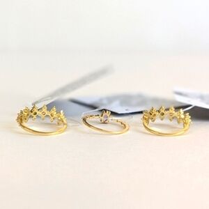 Three rings, three moods — each narrow band in radiant gold tone, crowned with simulated stones of pink, green, and amber or purple and clear. Worn together they create a kaleidoscope of light, worn alone they whisper restraint. The set moves between playful shimmer and refined edge, stacking color as if composing rhythm on the hand.