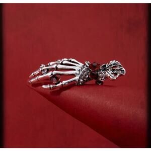 A darling skeleton hand reaches out from a cuff of red rhinestones daintily. A statement piece for any time of the year!