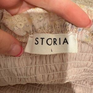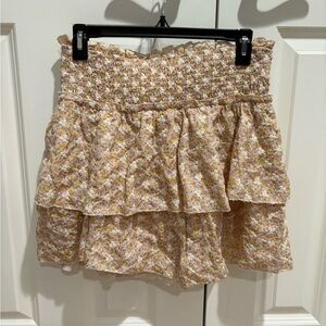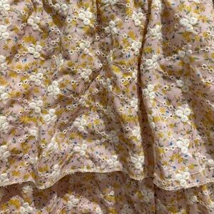 Adorable love shack fancy boutique dupe skirt. Has slight printed fabric with eyelet details. Has lining underneath and stretchy waistband. Size large.