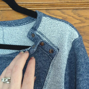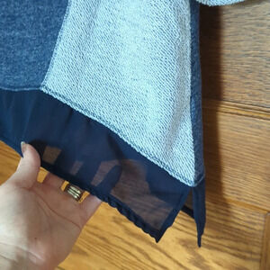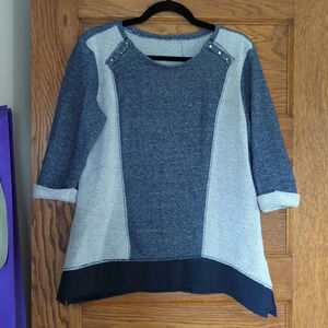 Beautiful 3/4 sleeve accented sweater with snaps on shoulder and sheer fabric around bottom hem.