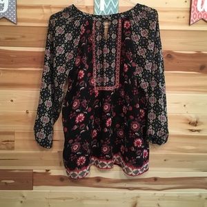 Absolutely beautiful boutique tunic - size L. Sheer and flowing, this top looks great over white shorts in the summer or over jeans in the fall. Will need to be worn over a tank. There is a bit of fraying and the 2 beads are missing on one of the tassels. (Beads could easily be replaced). Color: black, red, tan, smokey blue and hunter green. Measurements: pit to pit 21" - 26" length. Smoke-free/Pet-free home. Please feel free to ask any questions. No trades please 🌺