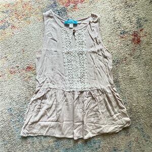 Boutique top with button closure and boho lace detail. Fitted top with peplum flowy hem. Great for layering with workwear.
